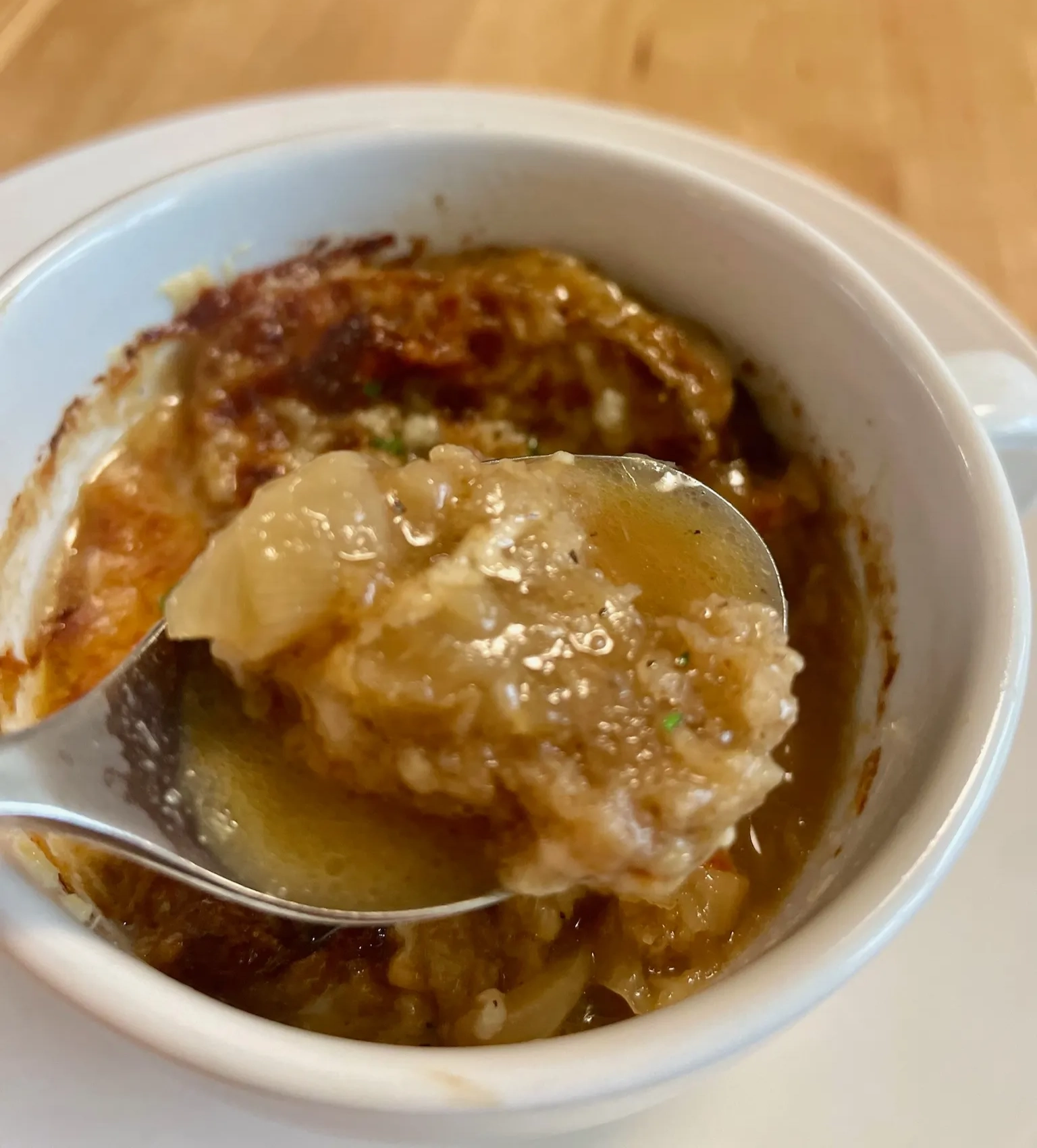 양파를 볶고 또 볶아 카라멜라이즈 시킨 후, 가마솥으로 고은 도가니탕 육수를 부어 약불에 오래 끓인 수프를 보울에 넣고 치즈를 올려 오븐에 구운 프렌치 어니언 수프