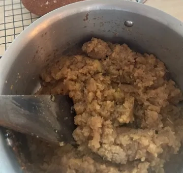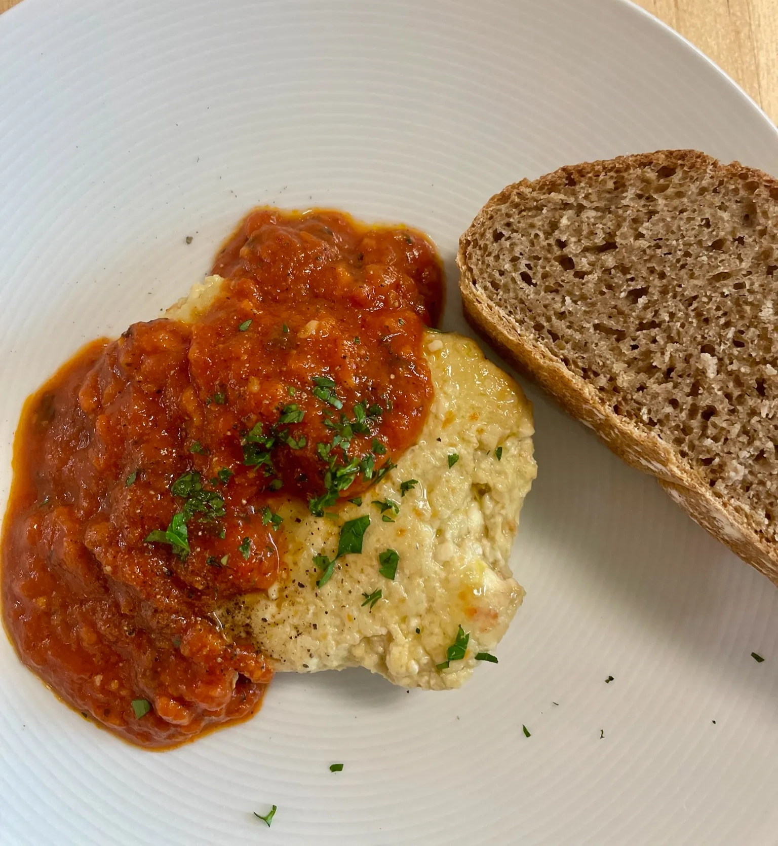 레몬소금으로 잰 후 믹서에 간 닭다리살과 두부와 양파를 버무려 구운 두부 치킨 스테이크. 마늘과 허브로 넣고 조린 토마토 소스와 환상의 조합