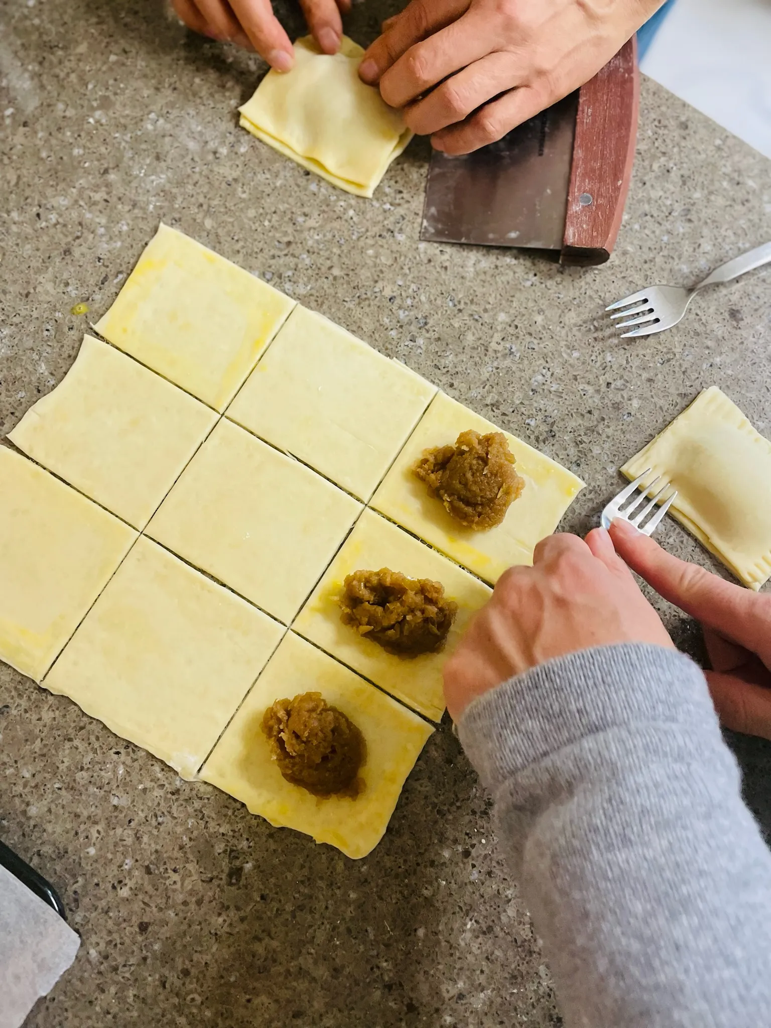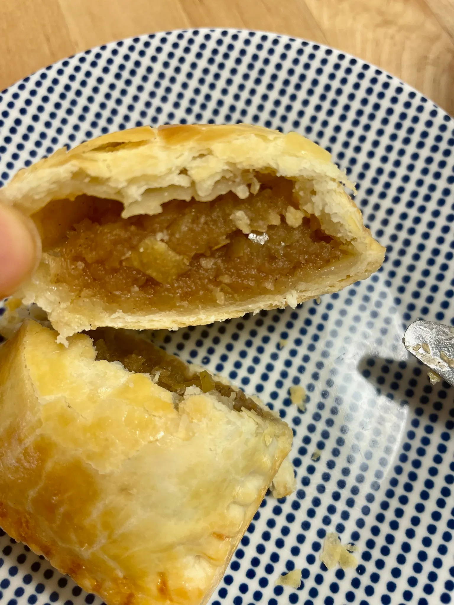 비정제원당 3%만 넣고 조린 사과 꽁포트를 채워 넣은 쇼송 오 뽐므(애플 파이). 구운 만두처럼 생겼네요