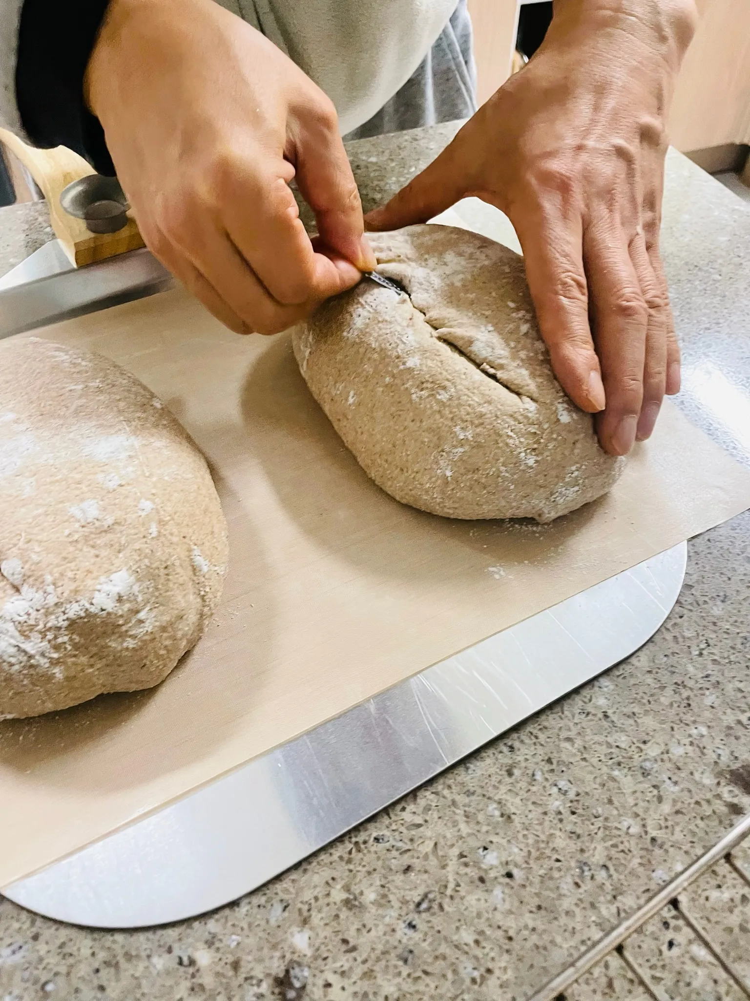 오픈 샌드위치에 사용할 소리빵 칼집 내는 중… 이제는 많이 익숙해졌어요