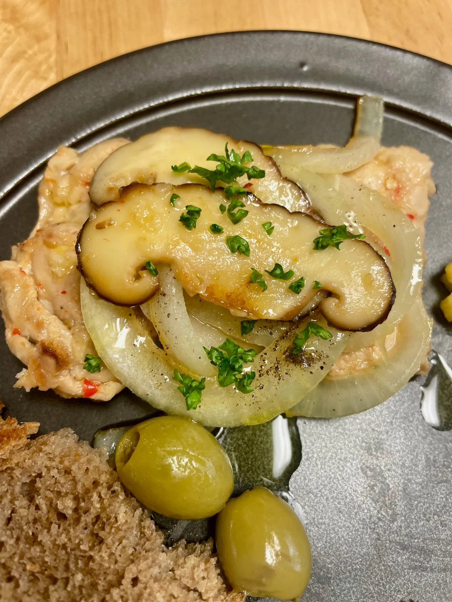 낭만주방 위크숍에서 직접 만든 ‘레몬소금’과 낭만주방이 개발한 ‘페페갈릭’, 다진 마늘, 식품첨가물 No 사케, 올리브유로 잰 닭다리순살 구이, 닭다리순살 구운 프라이팬에 구워낸 참나무에서 기른 화고(표고버섯) 구이를 곁들인 소리빵 오픈 샌드위치