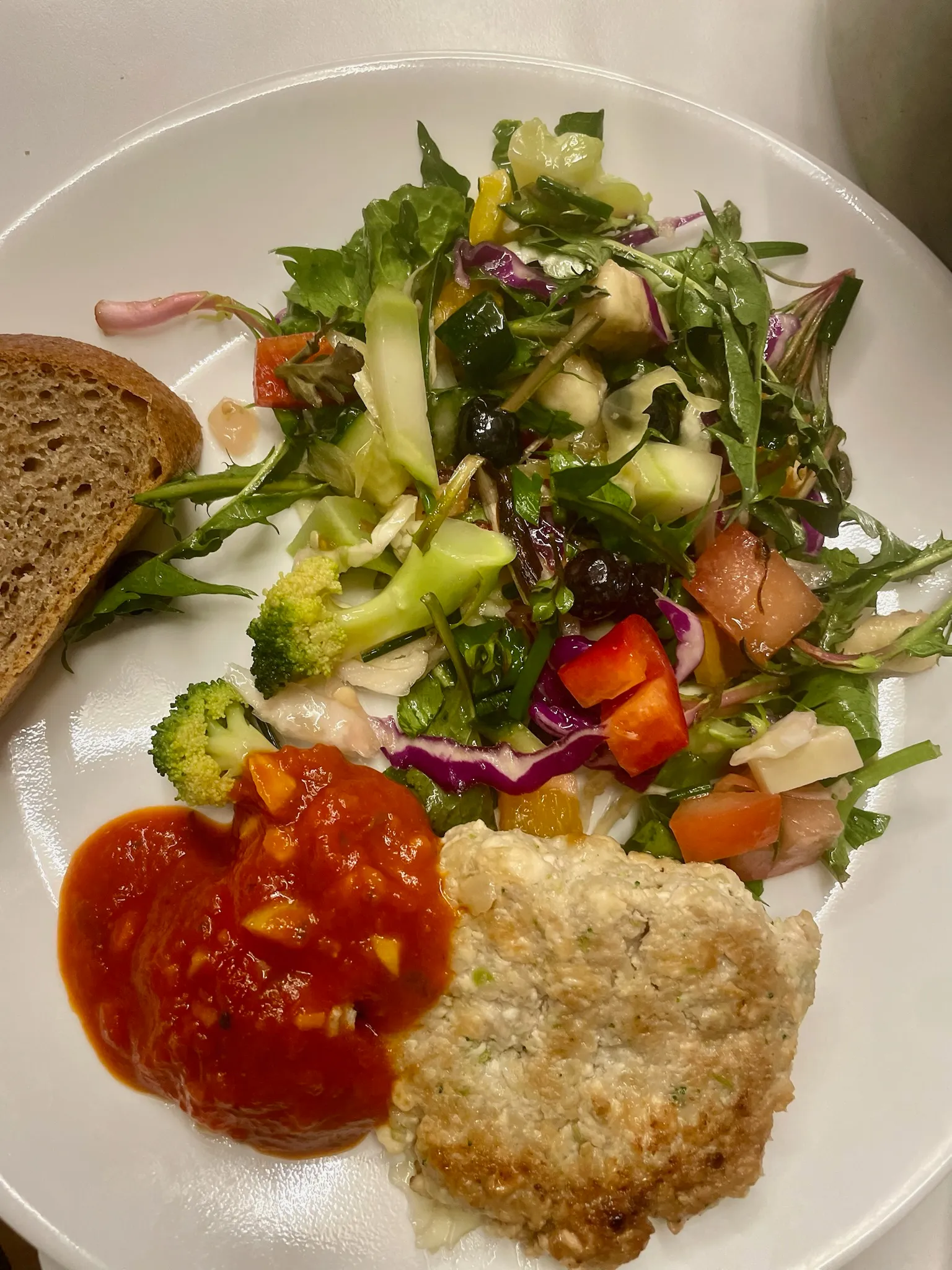레몬소금으로 저린 닭다리 순살과 양파, 두부, 그리고 식감과 색깔을 위해 추가한 약간의 브로콜리를 갈아 구운 두부 치킨스테이크와 유기농 토마토 소스에 산소리의 각종 허브와 다진 마늘을 넣고 조리한 토마토 소스. 토마토 소스는 남을 정도로 충분히 준비했다고 생각했는데 모자랄 뻔