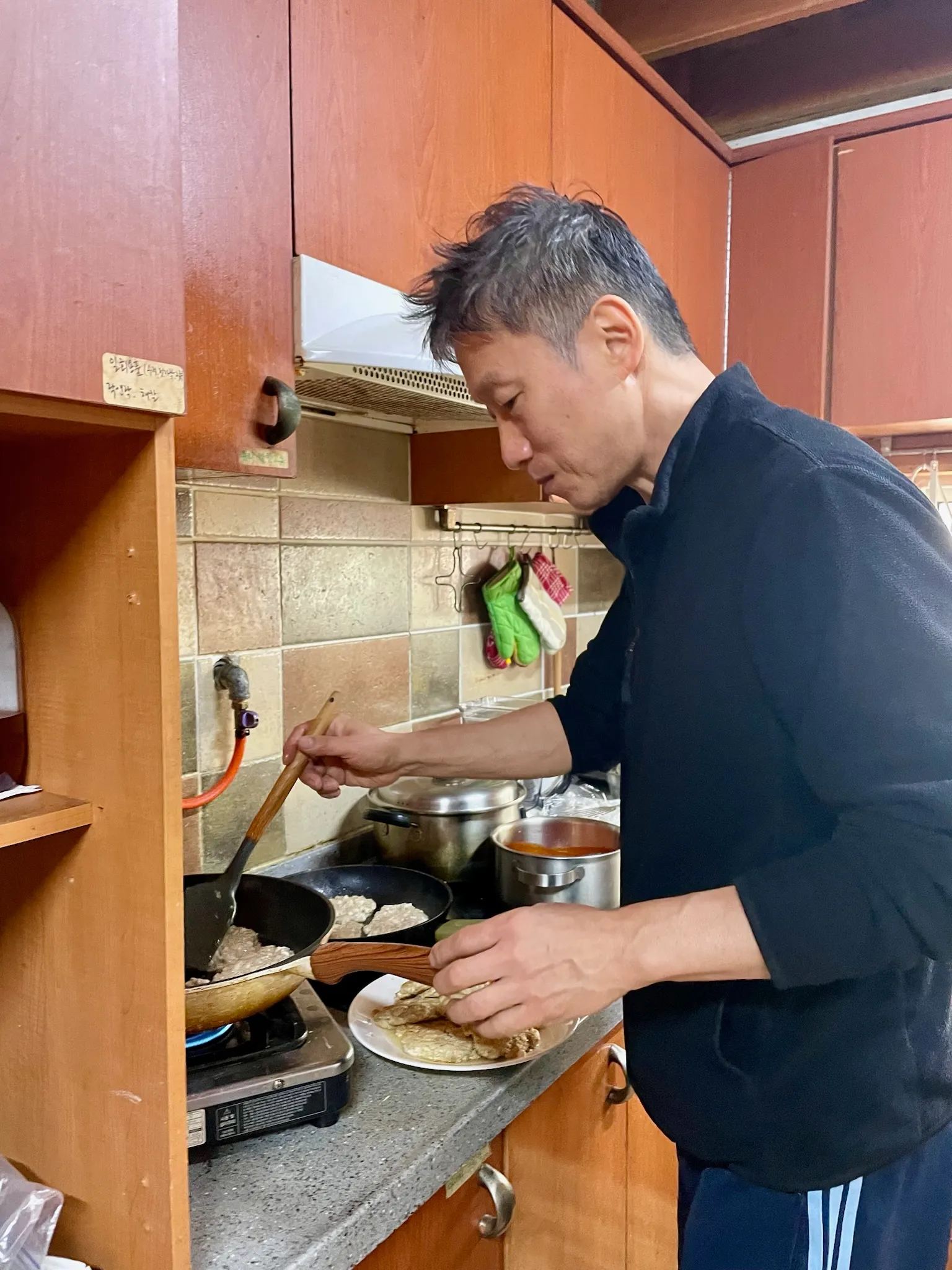 프라이팬 2개에 두부 치킨 스테이크 11개를 거의 동시에 구워내느라 진땀흘리는 소리