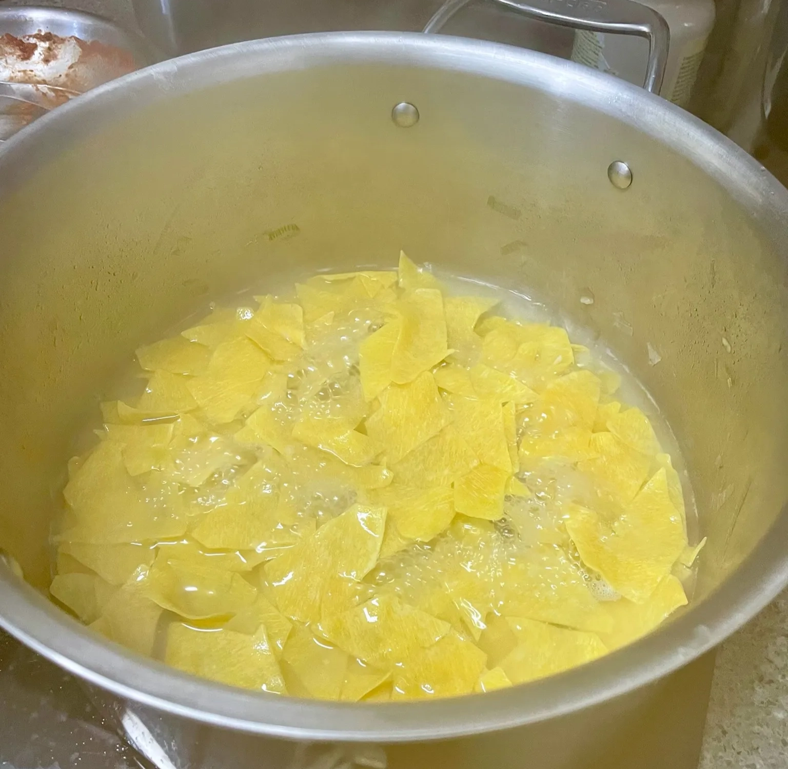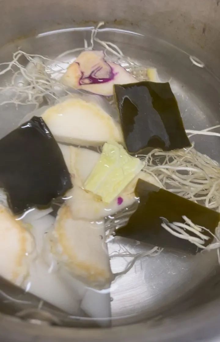 비시수아즈에 넣기 위해 각종 채소들의 꽁지들로 끓인 채수