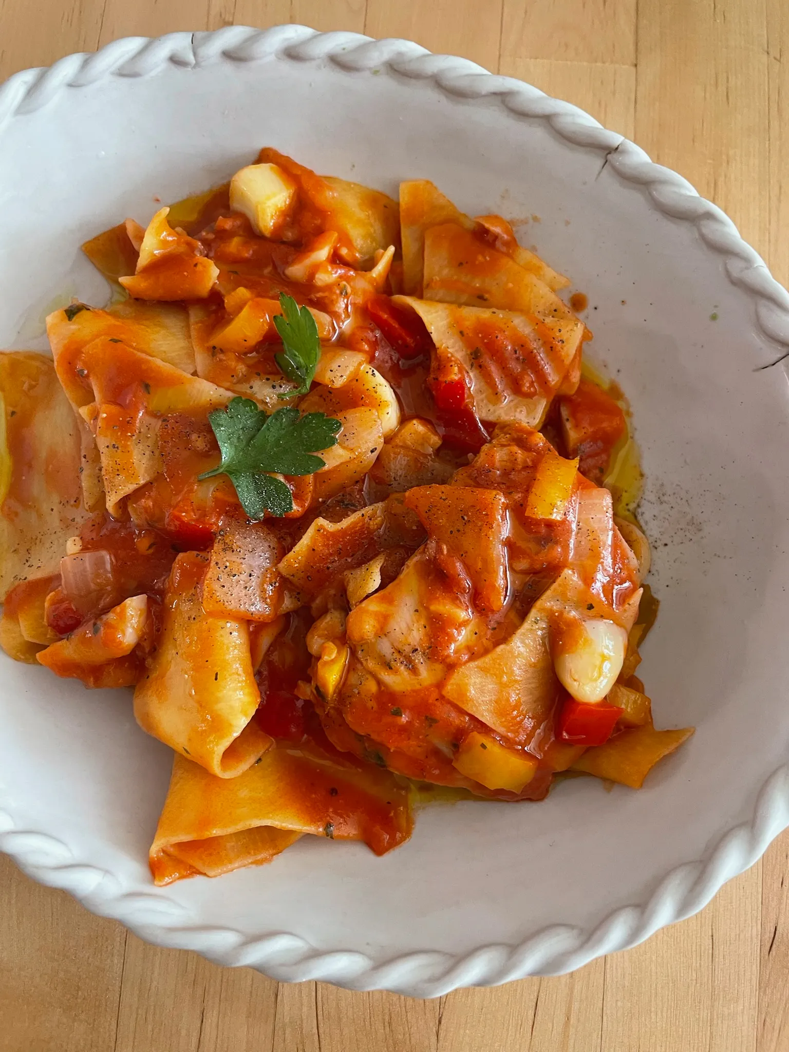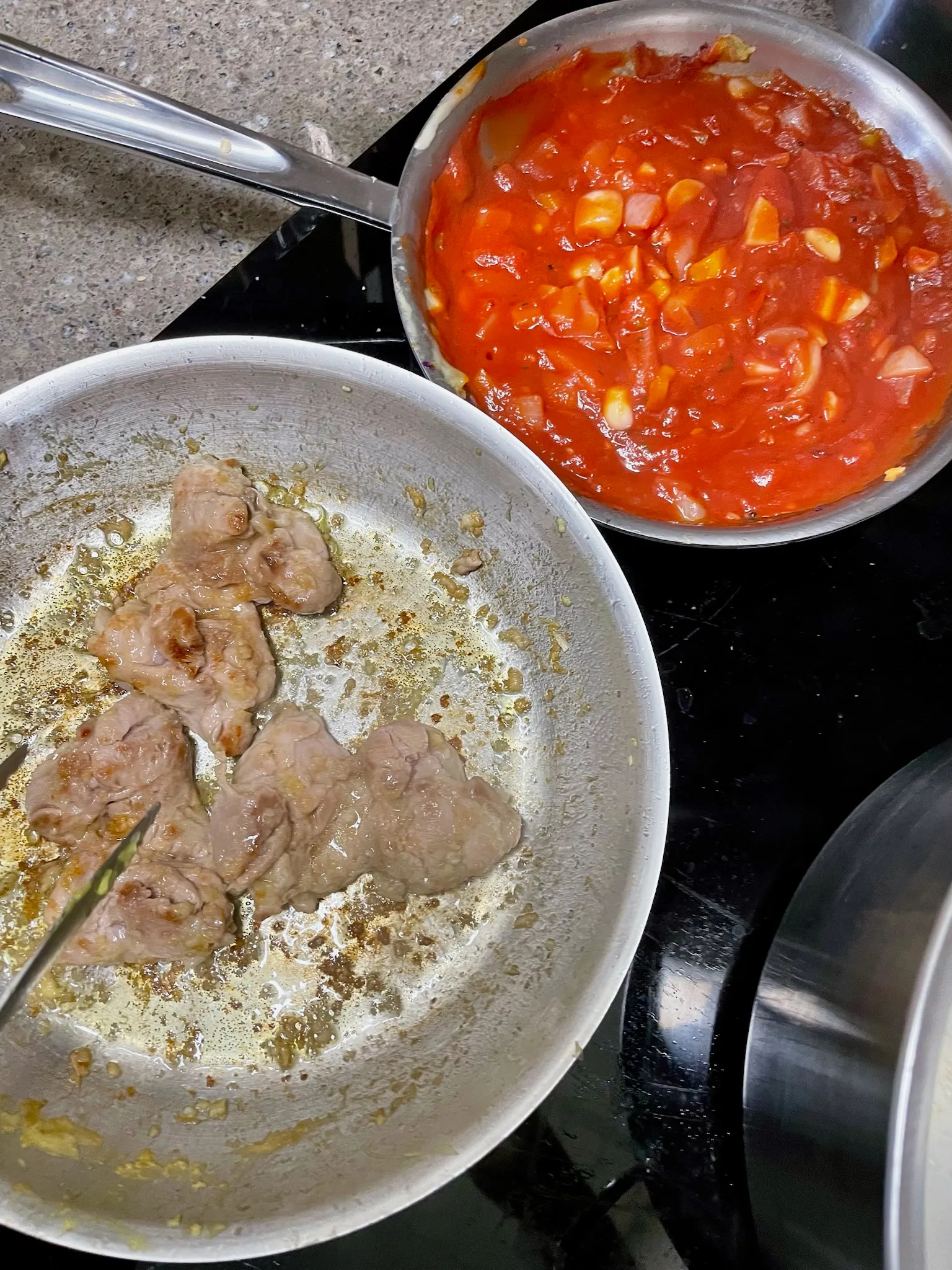 낭만베이커리만의 비법으로 저며 구운 닭다리살과 냉장고에 있던 유기농 토마토 페이스트로 만든 파스타 소스