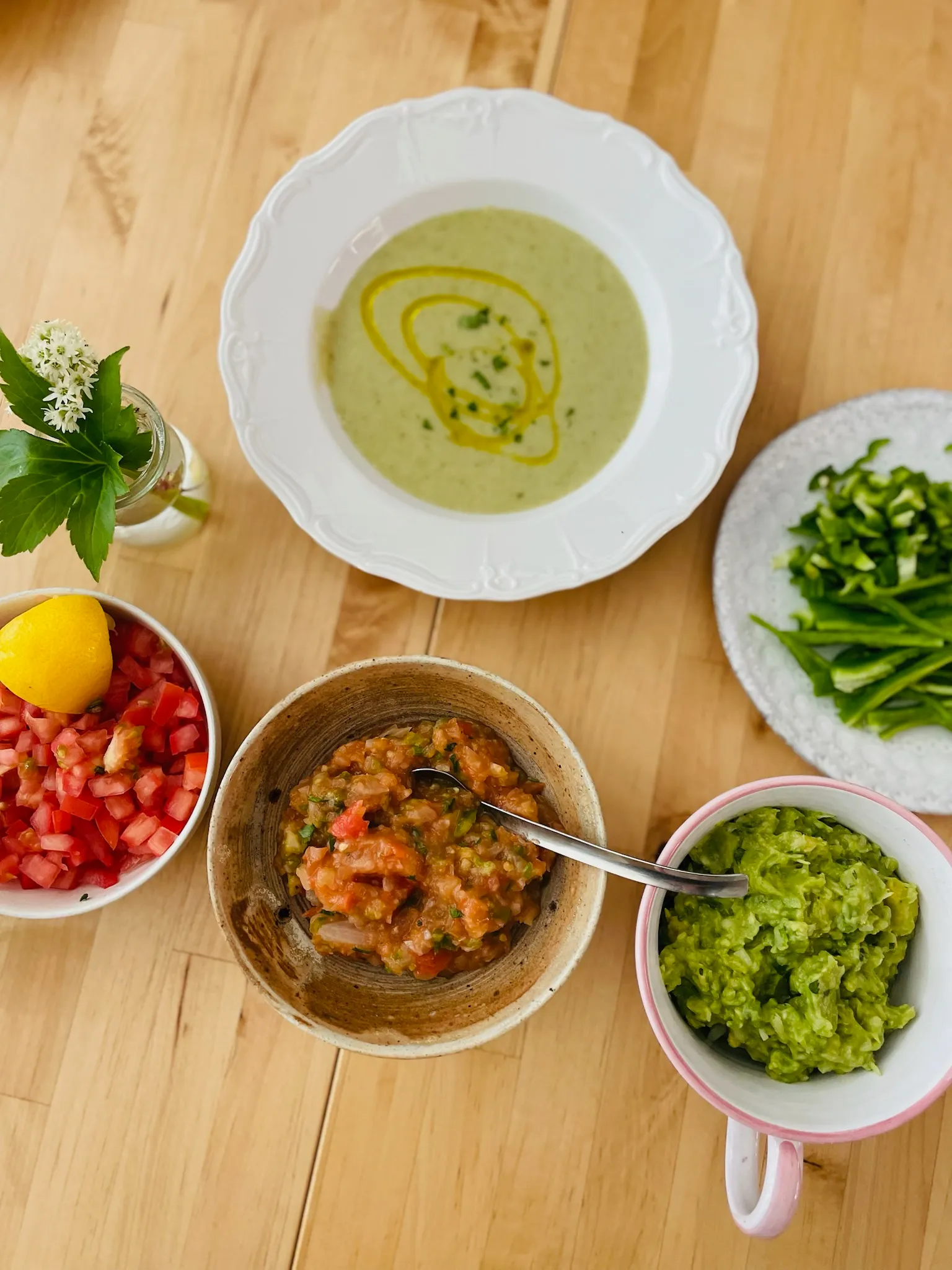 비시수아즈 수프를 응용해 만든 연두색 대파 샐러리 수프와 과카몰리, 살사, 토마토, 피망, 레몬이 어우러져 식탁이 화사하게 빛났습니다.