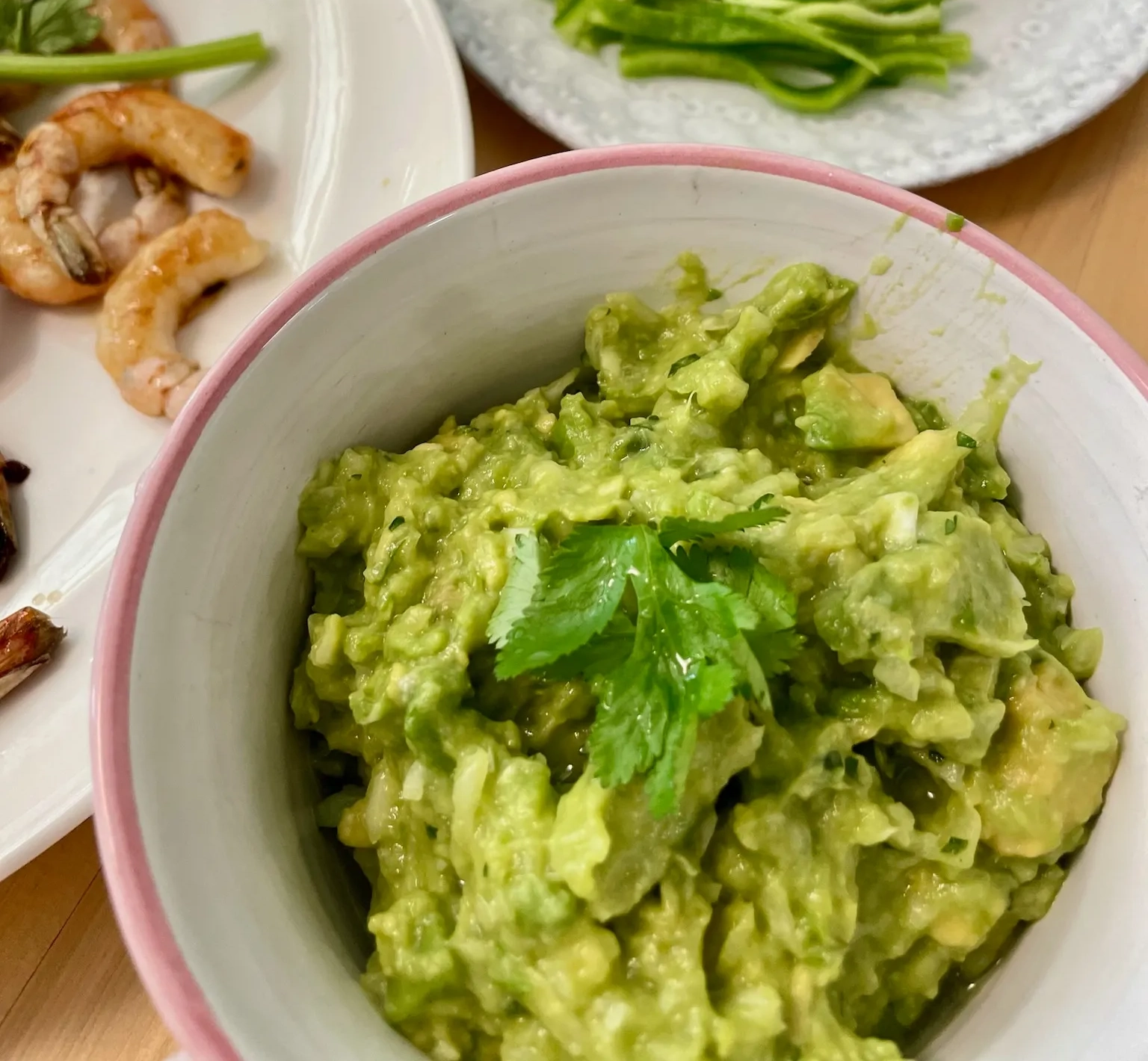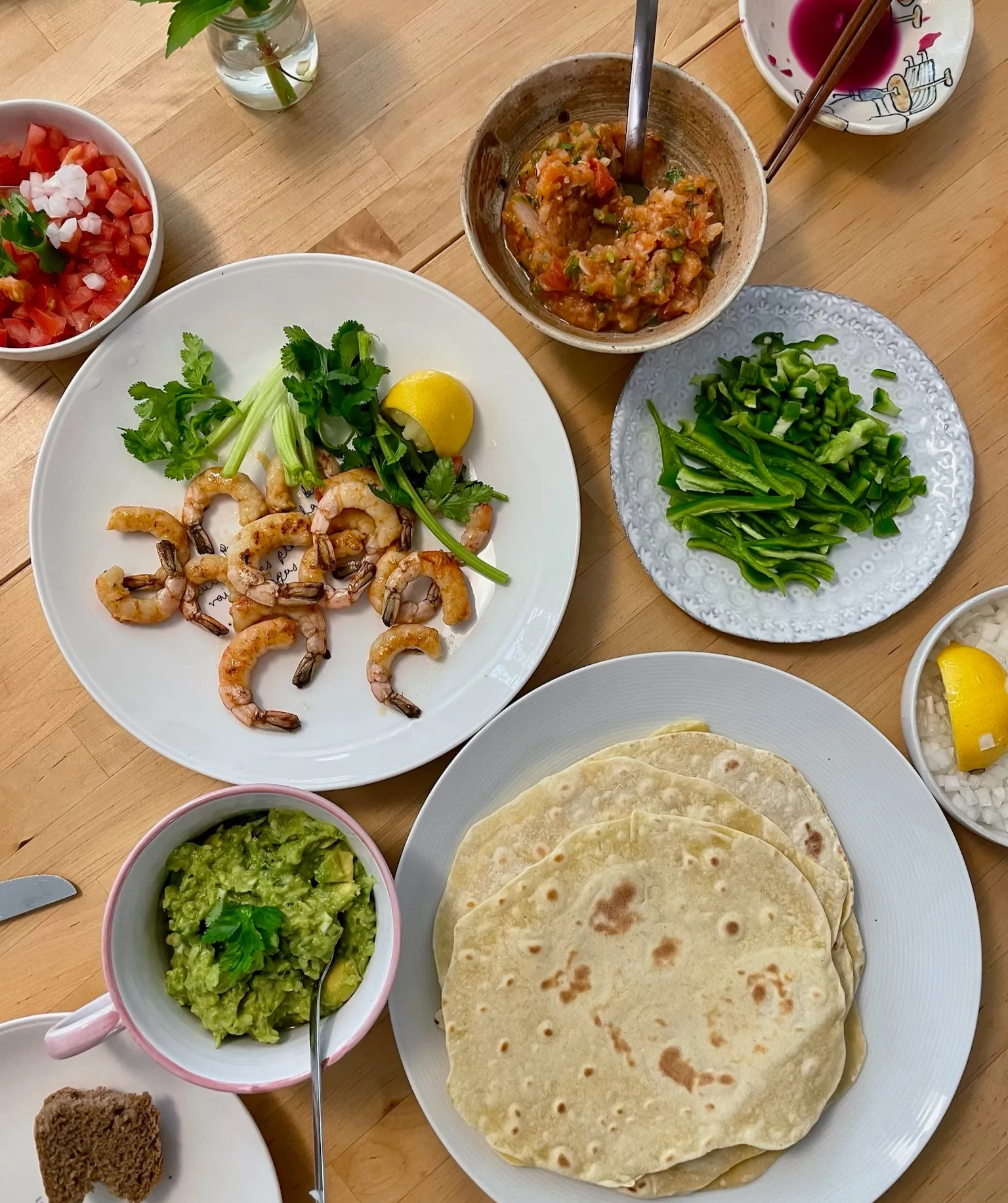 또디야, 과카몰리, 살사, 새우, 토마토, 피망 등이 어우러진 한 폭의 식탁