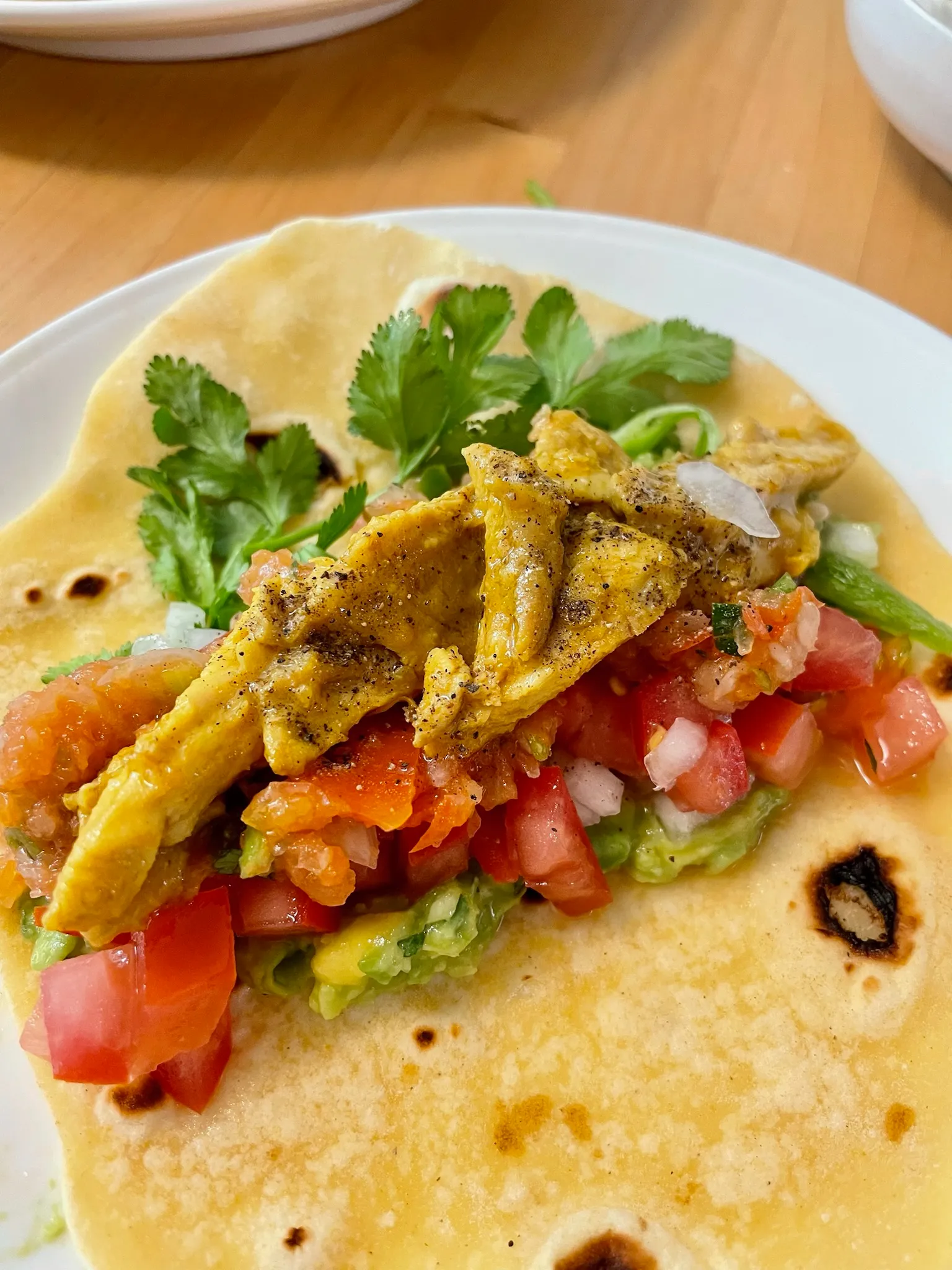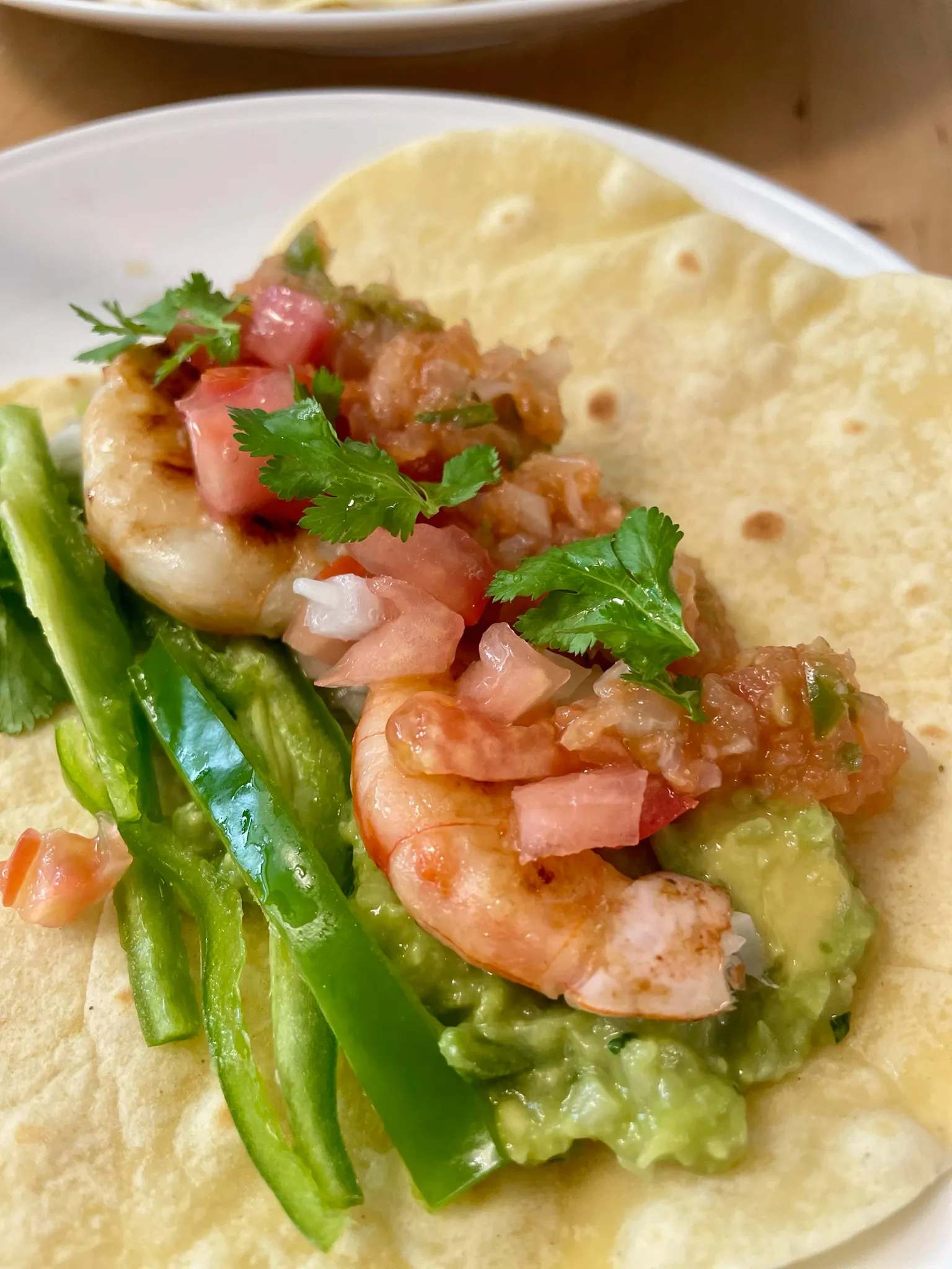 직접 구운 또띠야에 과카몰리를 바르고, 구운 새우를 얹고, 살사를 추가한 후 피망, 토마토, 고수로 마무리한 쉬림프 타코