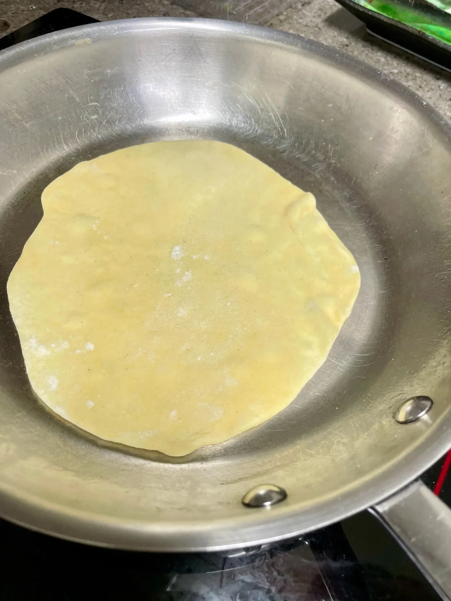 이철규 농부님의 강력분과 유기농 옥수수 가루를 섞어 함께 빚은 또띠야 반죽. 밀어놓고 굽기전에 수프 먹고 왔더니 반죽이 전부 붙어버려서 처음부터 다시 빚고 밀었다는